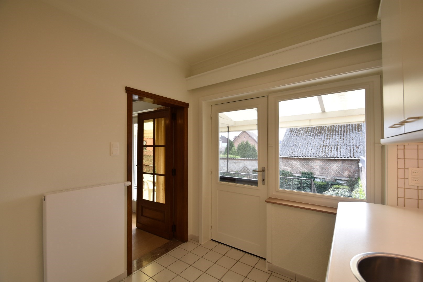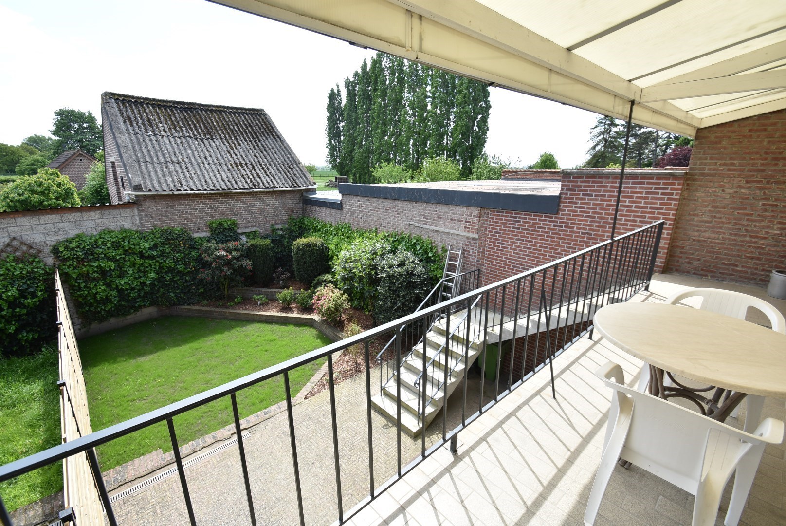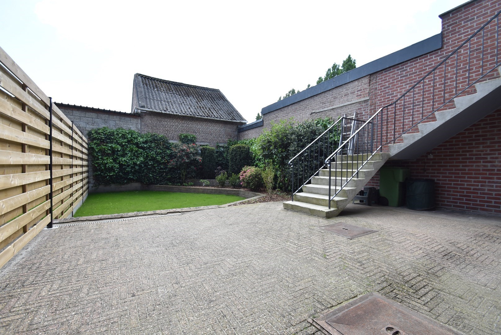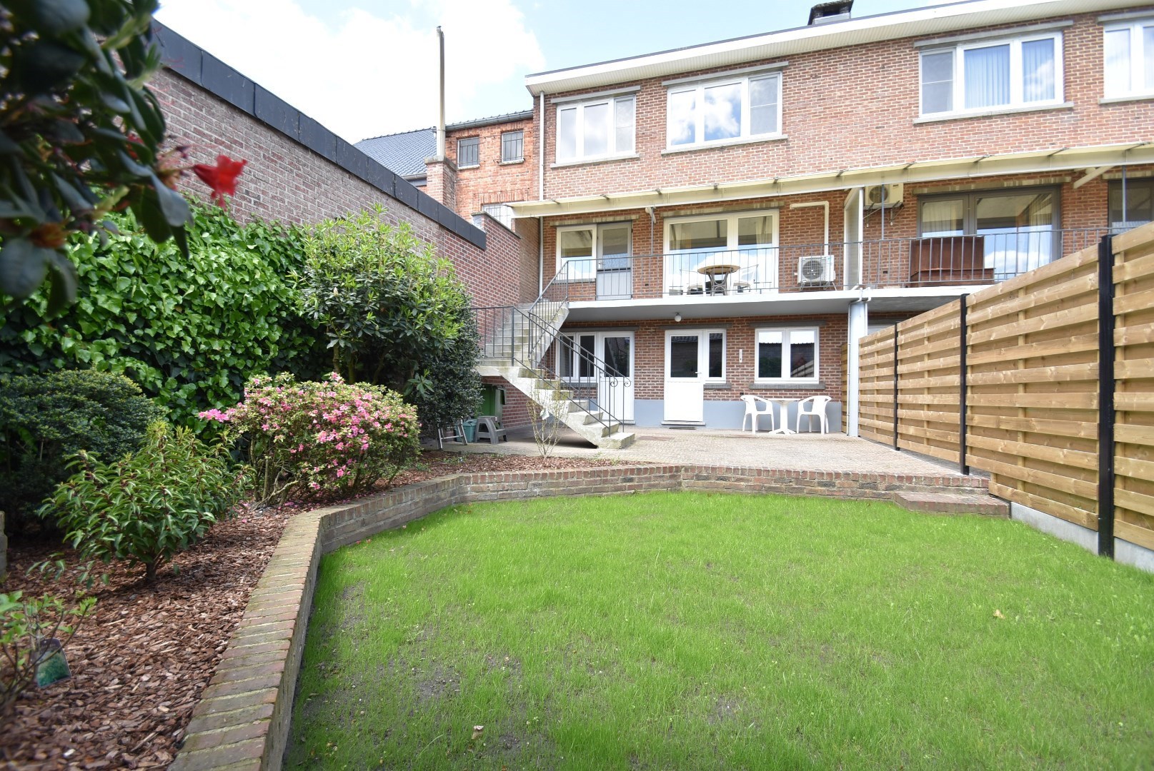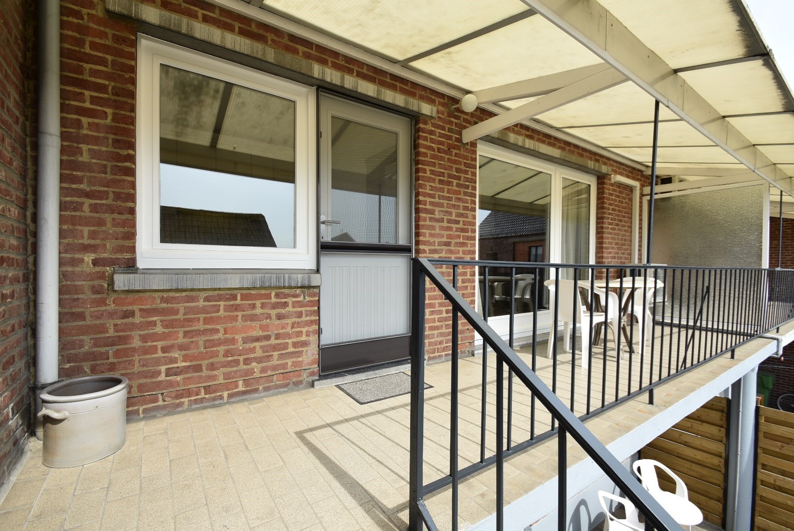 ruim, deels overdekt terras en volledig omheind tuintje met pas ingezaaid gazon.