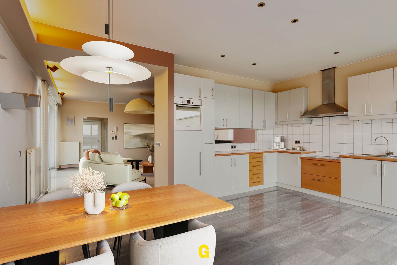 - Fijne open leefruimte, ingedeeld met gezellige zitruimte en open keuken, gescheiden door een (mogelijk wegneembare) wand met doorgeefluik