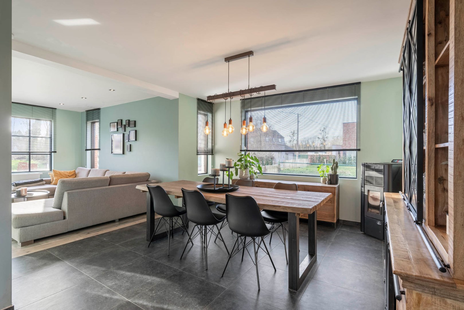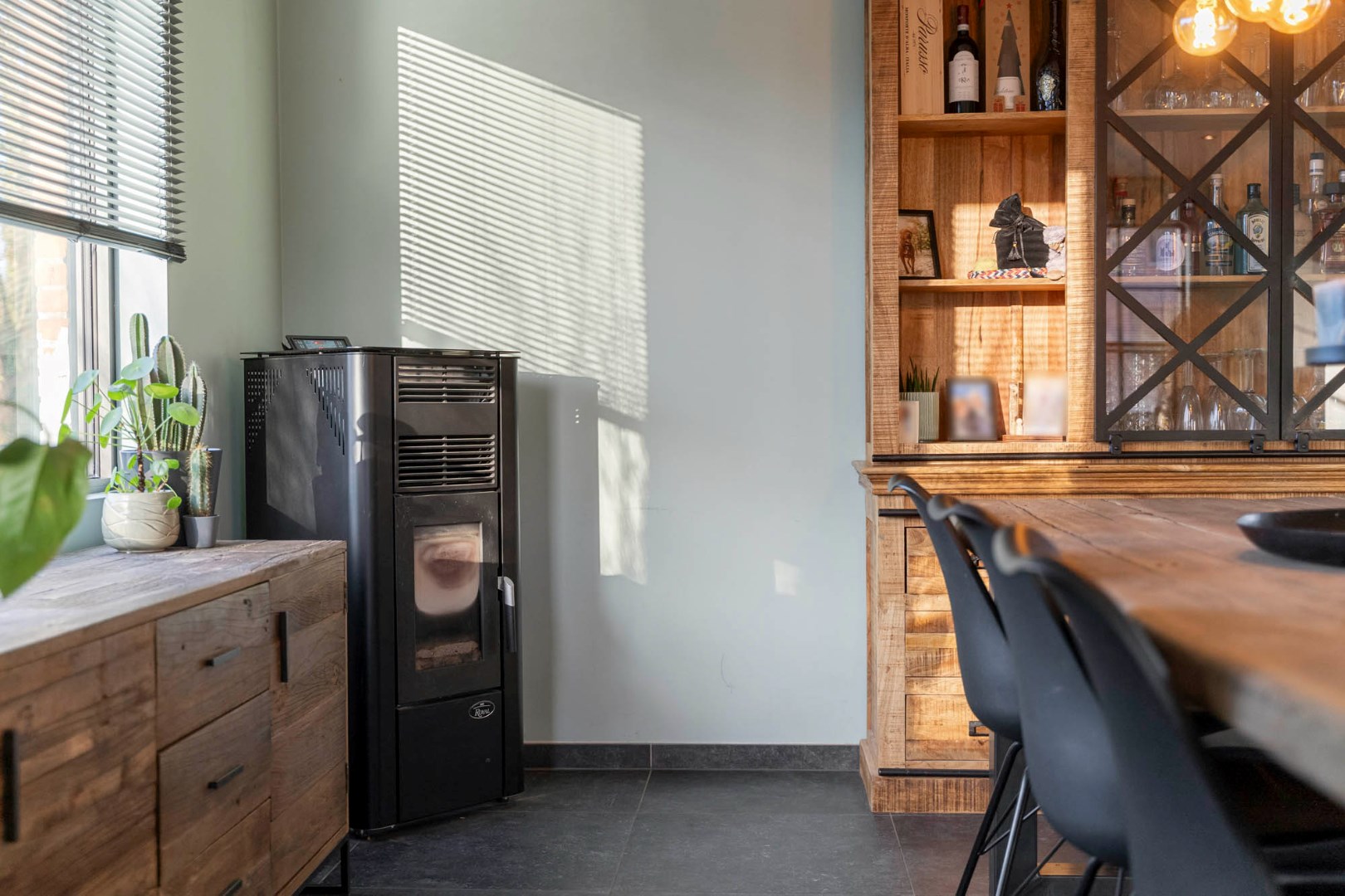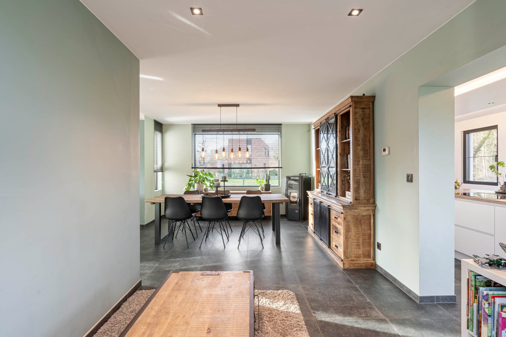Inkom met trap, gastentoilet en glazen deur die leidt naar de aangename lichtrijke leefruimte. De leefruimte in L-vorm is ingedeeld met een knusse zitruimte, een eetplaats met gezellige pelletkachel en een aansluitende ruimte die dienst kan doen als leuke speelhoek of bureel. De vernieuwde leefkeuken met zicht op de tuin en achterliggende omgeving is knap afgewerkt en ingericht met de nodige toestellen van zeer degelijke kwaliteit, zoals de oven, combi-oven, vaatwasser, frigo, kookplaat en ingebouwde dampkap.