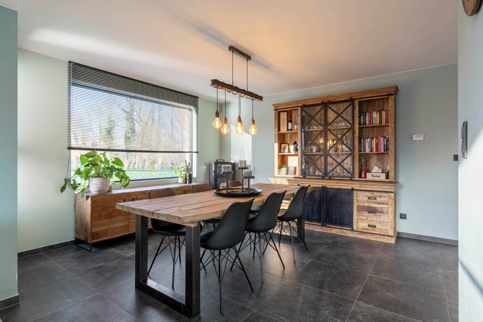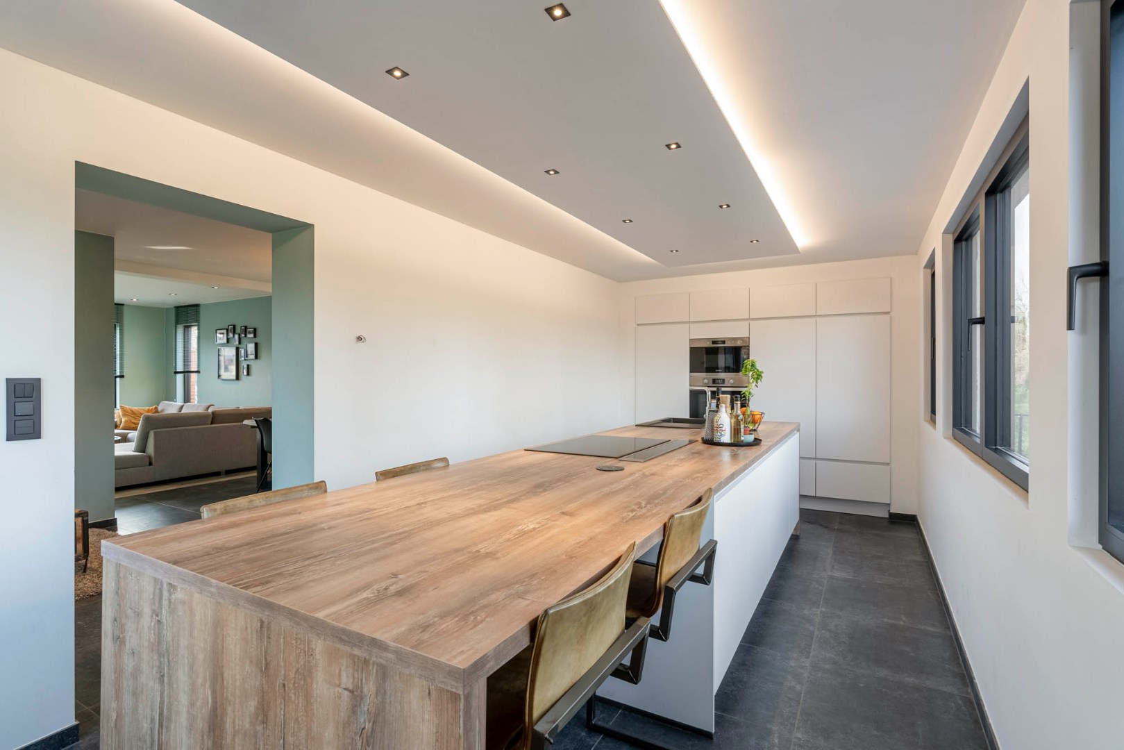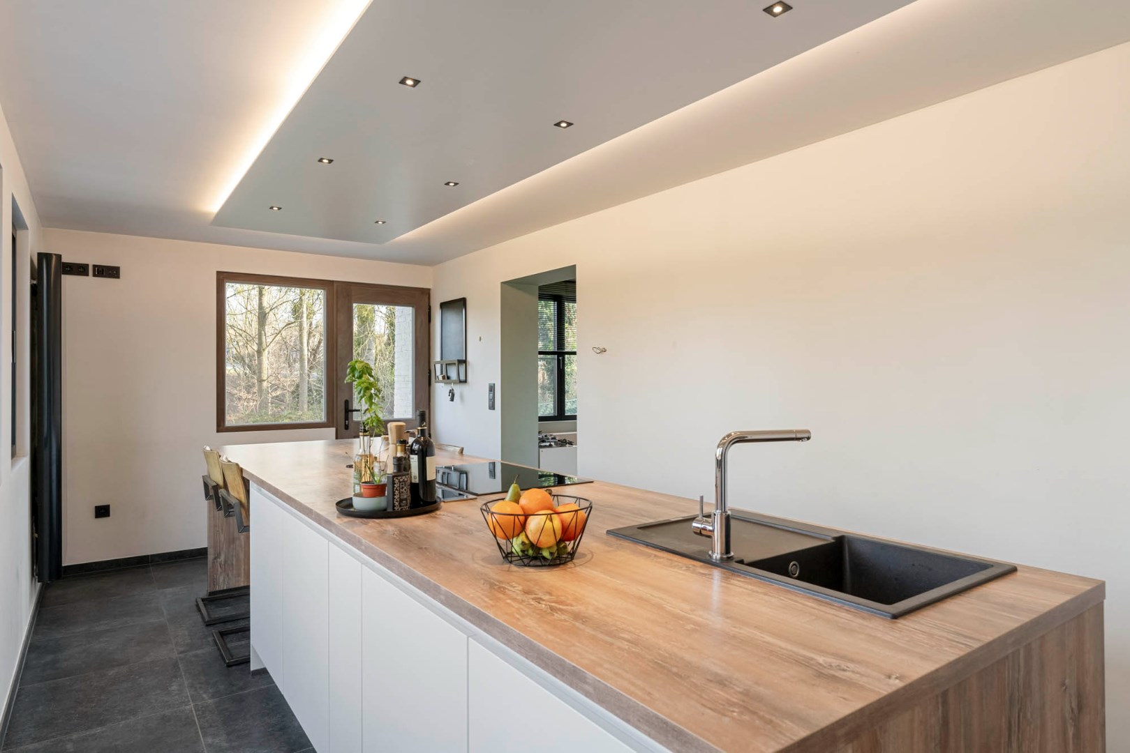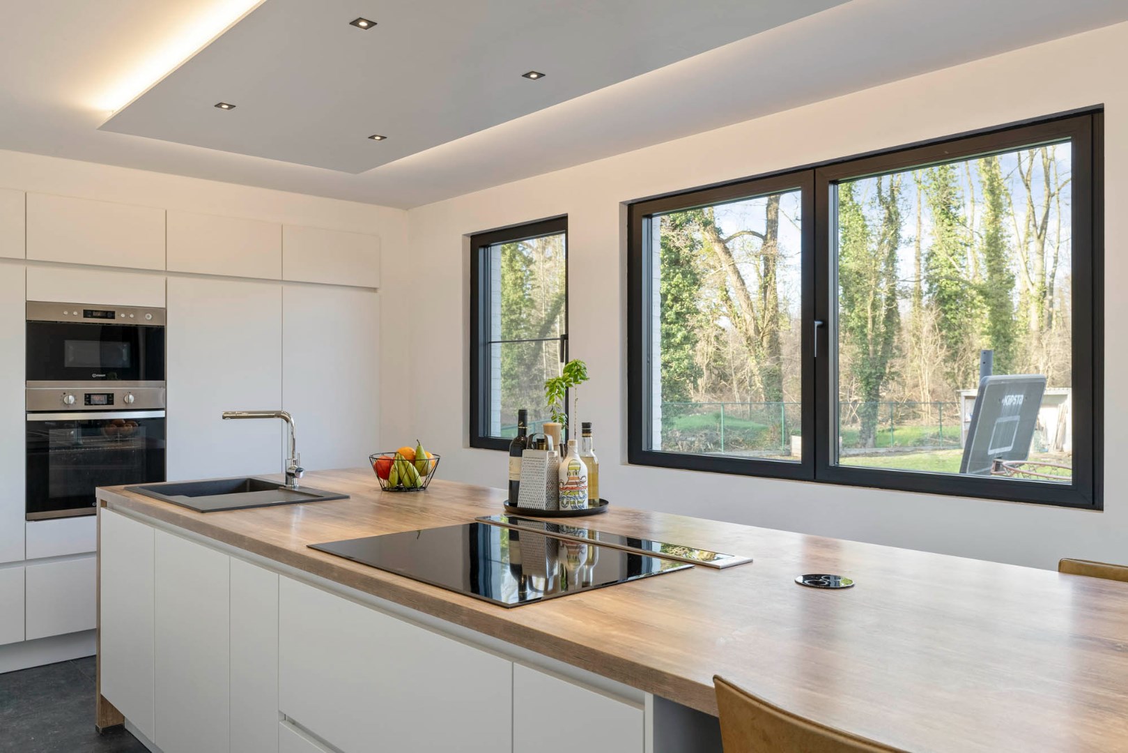 Inkom met trap, gastentoilet en glazen deur die leidt naar de aangename lichtrijke leefruimte. De leefruimte in L-vorm is ingedeeld met een knusse zitruimte, een eetplaats met gezellige pelletkachel en een aansluitende ruimte die dienst kan doen als leuke speelhoek of bureel. De vernieuwde leefkeuken met zicht op de tuin en achterliggende omgeving is knap afgewerkt en ingericht met de nodige toestellen van zeer degelijke kwaliteit, zoals de oven, combi-oven, vaatwasser, frigo, kookplaat en ingebouwde dampkap.