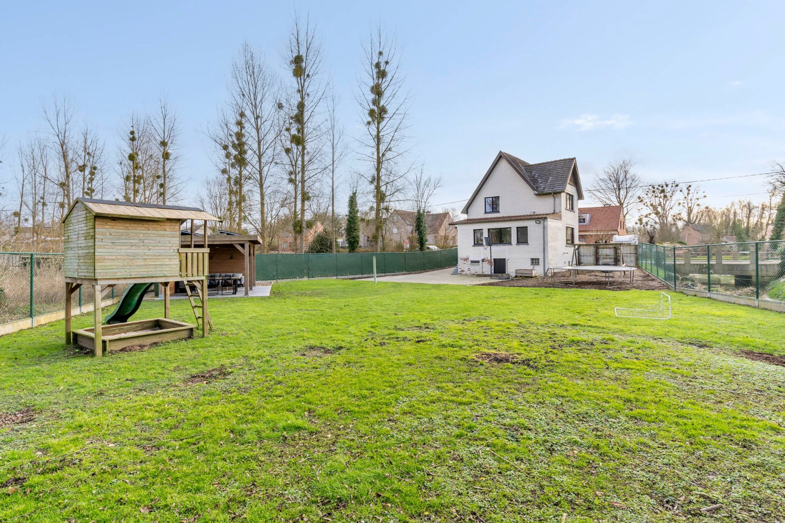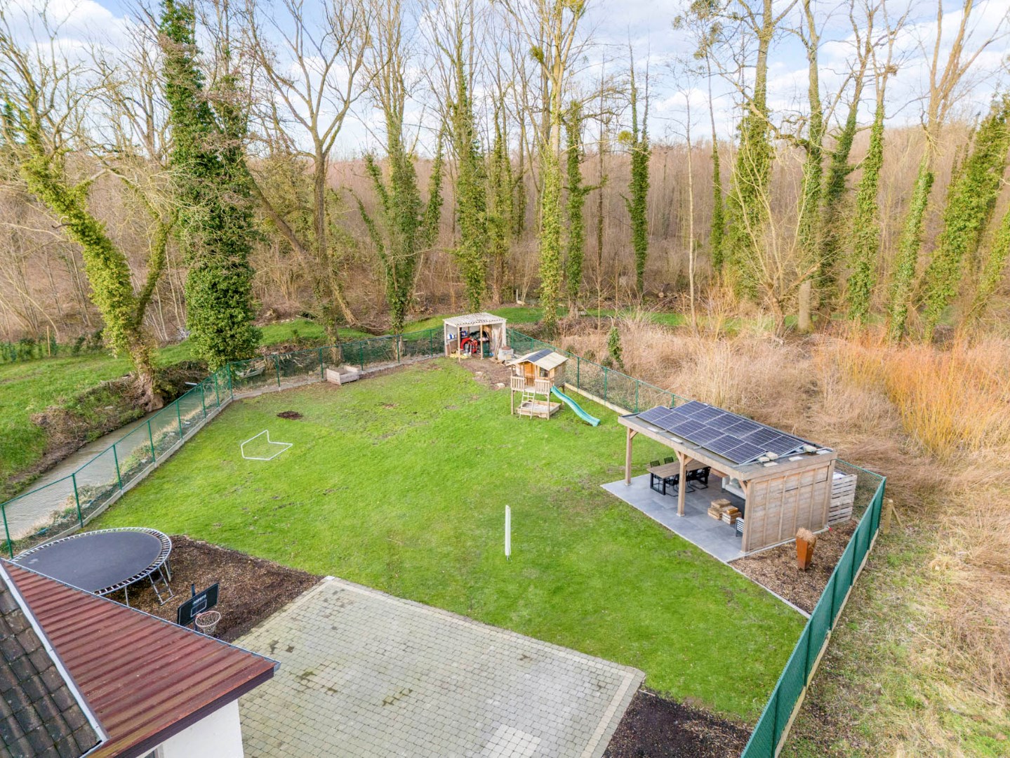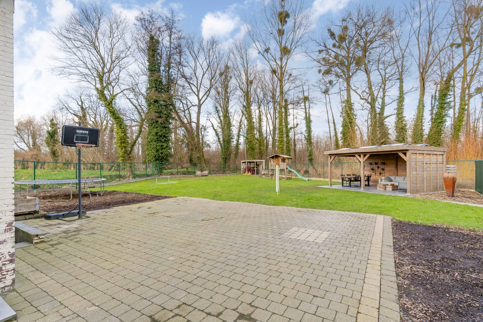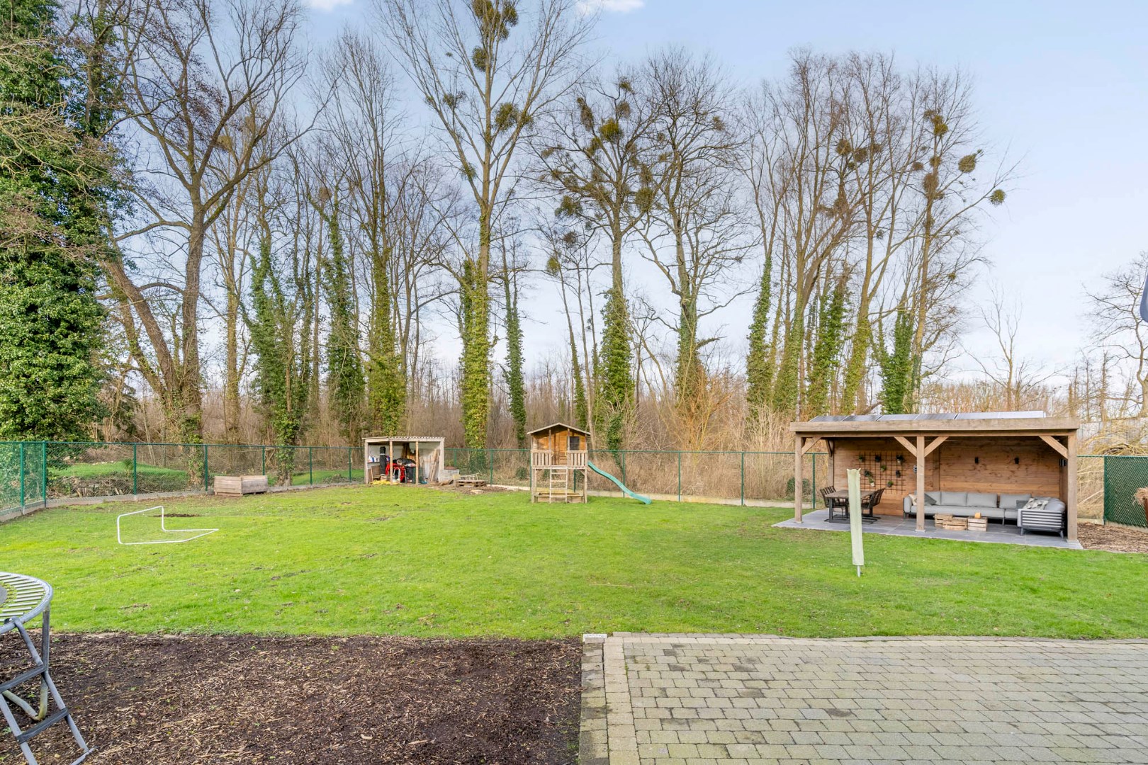 Ruime volledig omheinde en afgesloten tuin met zicht op het achterliggend groen, prachtig overdekt terras gevloerd met een mooie tegel, met voldoende ruimte voor een eet- en loungehoek - werkelijk een heerlijke plek om tot rust te komen en te genieten van de mooie omgeving in alle rust en privacy, zonder enige hinder van buren.