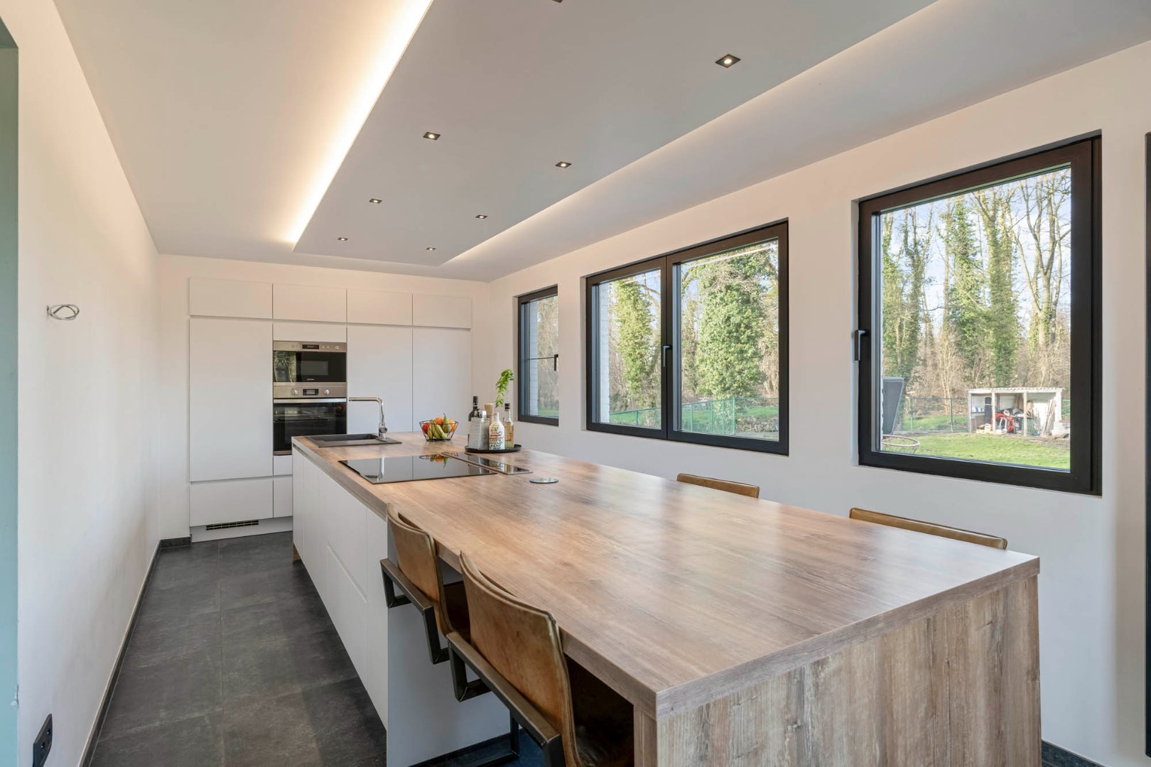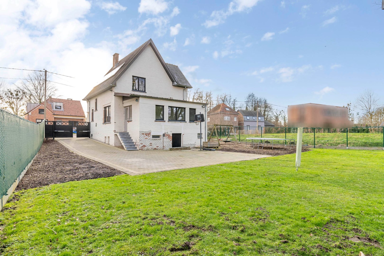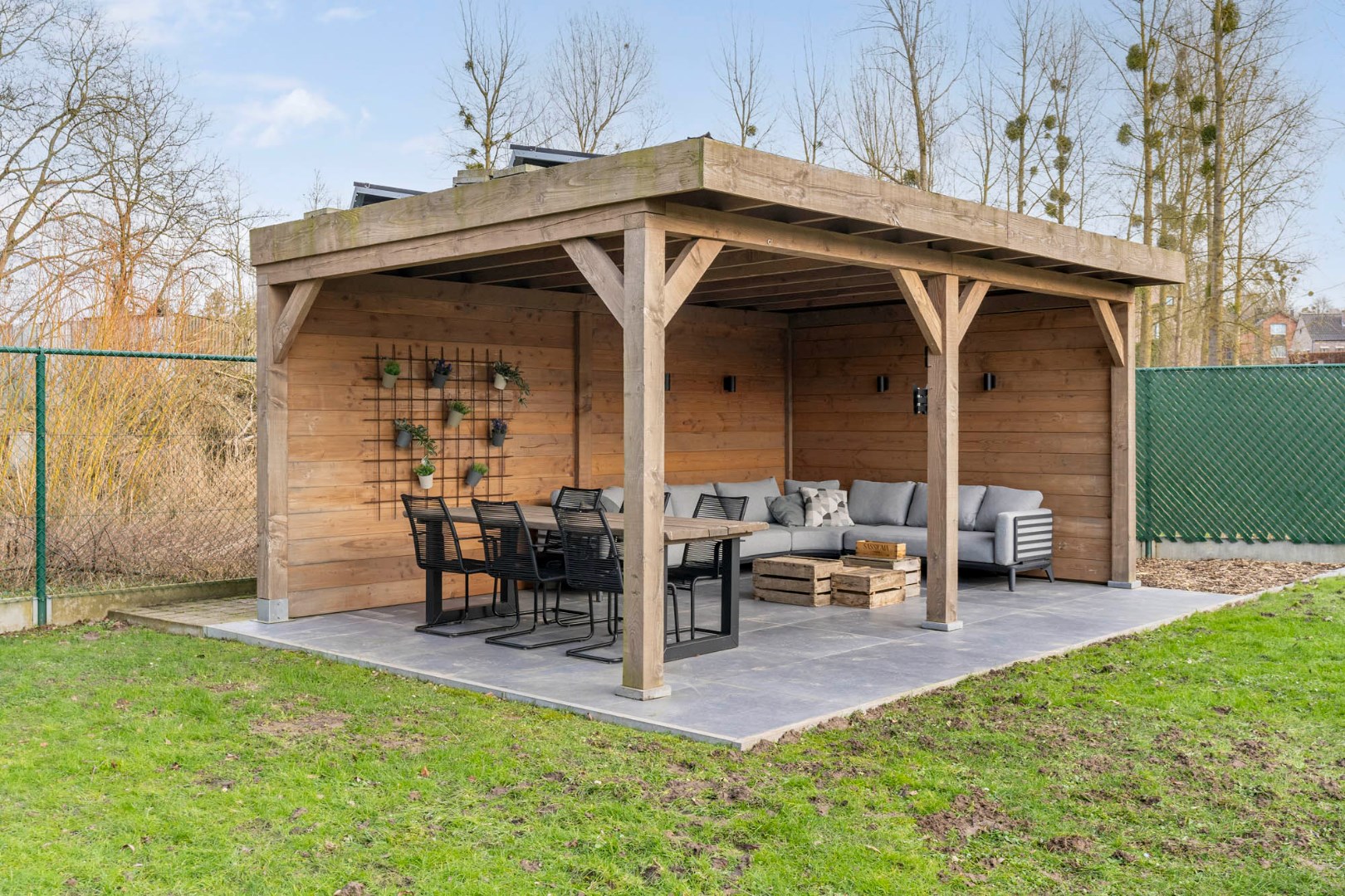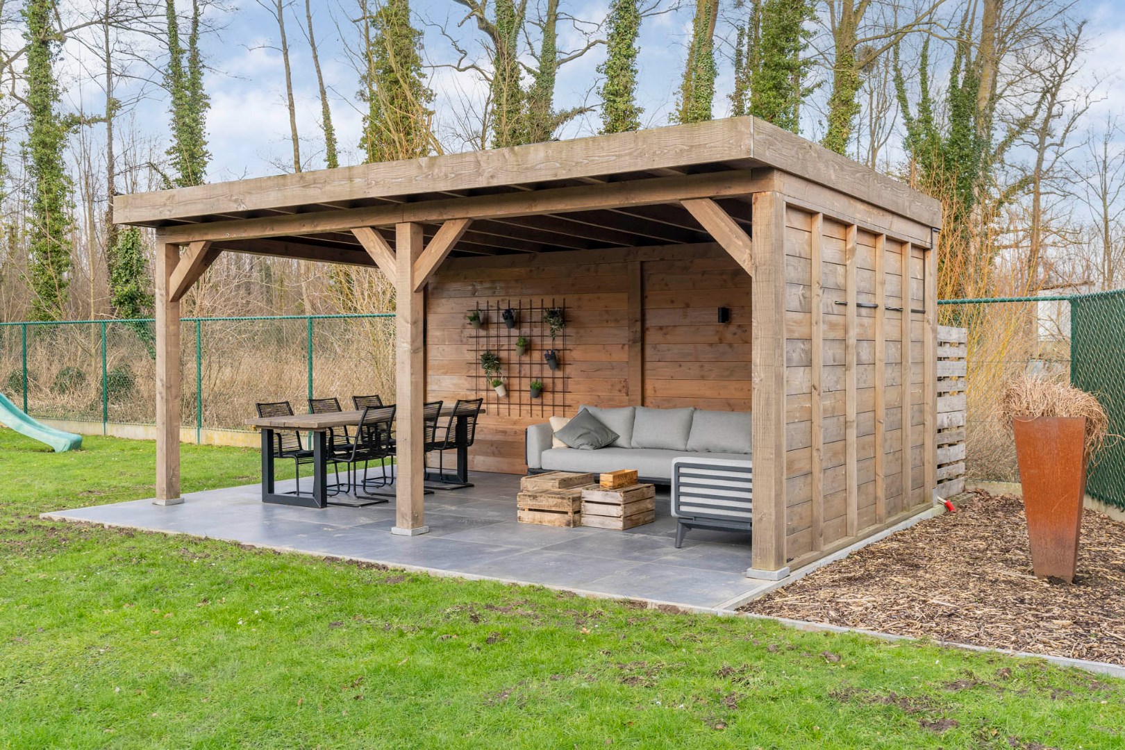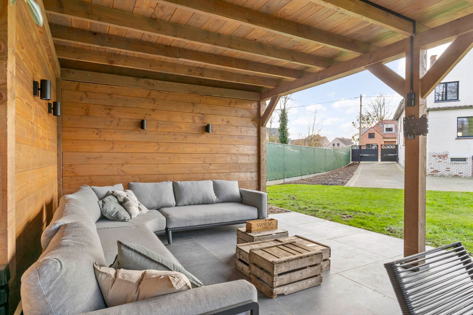 Ruime volledig omheinde en afgesloten tuin met zicht op het achterliggend groen, prachtig overdekt terras gevloerd met een mooie tegel, met voldoende ruimte voor een eet- en loungehoek - werkelijk een heerlijke plek om tot rust te komen en te genieten van de mooie omgeving in alle rust en privacy, zonder enige hinder van buren.